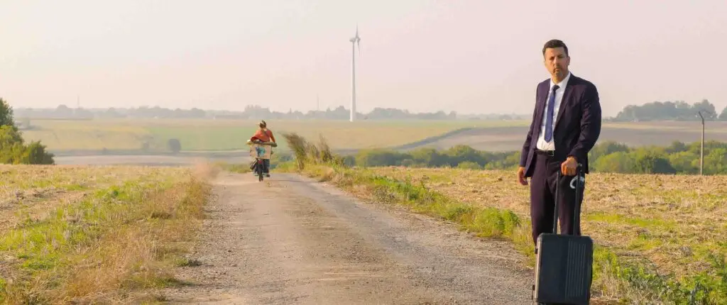 … part, depuis l’aéroport de Beauvais où il déclare avoir perdu ses papiers, à pied à travers la campagne, suivant des routes et des chemins et coupant parfois à travers champs de tournesols et de maïs, consultant une boussole pour s’orienter. Il traîne derrière lui une valise à roulettes attachée à son poignet par des menottes et fait diverses rencontres : un policier stagiaire qui se prend pour le taxi driver de Scorsese…